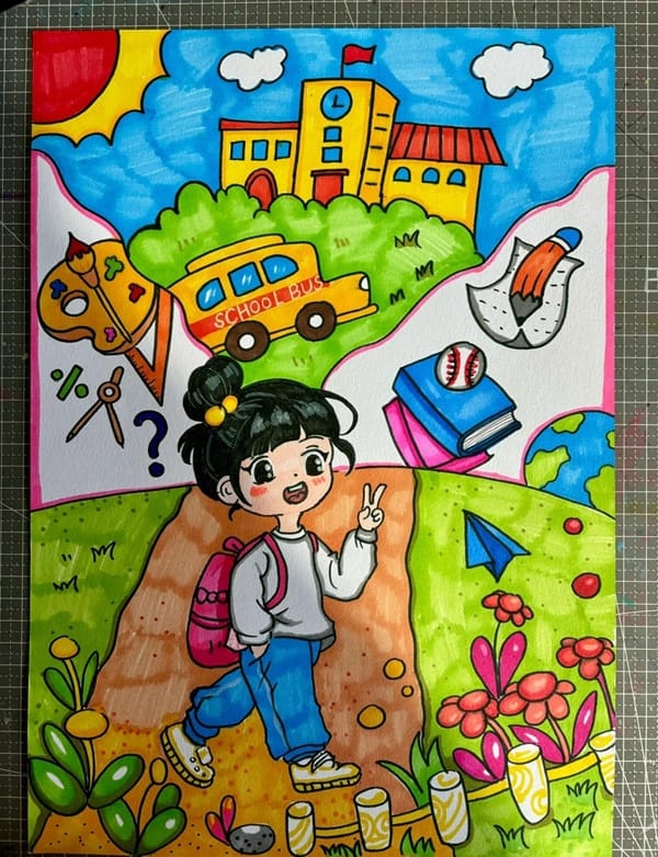 Trường học là nơi ghi dấu những kỷ niệm tuổi thơ và thanh xuân đầy hứng khởi. Những bức tranh vẽ trường học không chỉ tái hiện một không gian học tập, mà còn lưu giữ những khoảnh khắc đầy cảm xúc của mỗi học trò: những giờ phút ngồi trên ghế nhà trường, những trò chơi ngoài sân, và cả những con đường quen thuộc